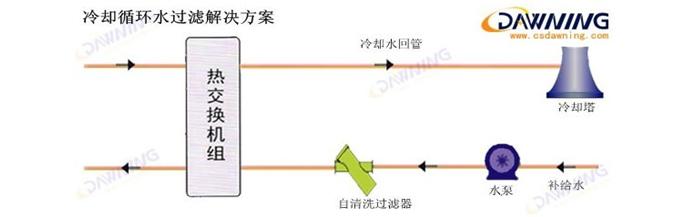 我們?yōu)槠涮峁┑倪^濾解決方案解決這一問題,如上面流程圖所示,我們在水泵和換熱器之間設備一臺自清洗過濾器(電動刷式過濾器或電動式自動排污過濾器),根據(jù)現(xiàn)場實際情況,選擇相應的過濾網和過濾精度,這些將保證在不影響水系統(tǒng)正常運行的狀況下,自清洗過濾器會過濾掉符合精度的所有雜質,并在設定的壓差或時間范圍內自動清洗濾網、自動排污。自清洗過濾器的設置,將大大提高系統(tǒng)的換熱效率、減少系統(tǒng)補水量、提高水的濃縮比,達到節(jié)水、節(jié)能、環(huán)保的目的。